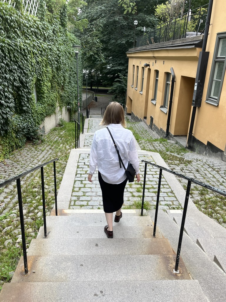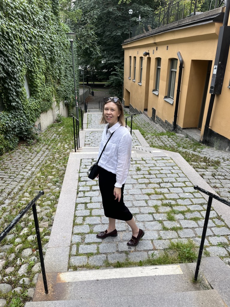 Stockholm in August. Strolling around in Södermalm area before dinner. The weather was warm and cloudy. I´m not often in this area of Stockholm, but it was nice to explore a new place. Our dinner place had a dress code, they requested their guests to be well dressed. That basically means smart casual, something that you wear for work. I’m wearing a knitted skirt in black with a knitted top paired with a white shirt made of cotton linnen blend. Off to an outdoor concert tomorrow, hope it doesn’t rain too much.